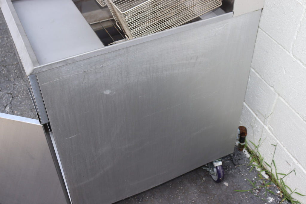 The DUKERS DCF5-NG Deep Fryer is a 75-pound capacity commercial kitchen equipment designed for deep fat frying. With a 21" wide five-tube natural gas burner system, this floor model fryer offers efficient and consistent heat distribution for cooking large quantities of food. Its sturdy construction and castor wheels make it easy to move around and clean, providing a convenient solution for restaurants and food service establishments looking for reliable frying equipment.