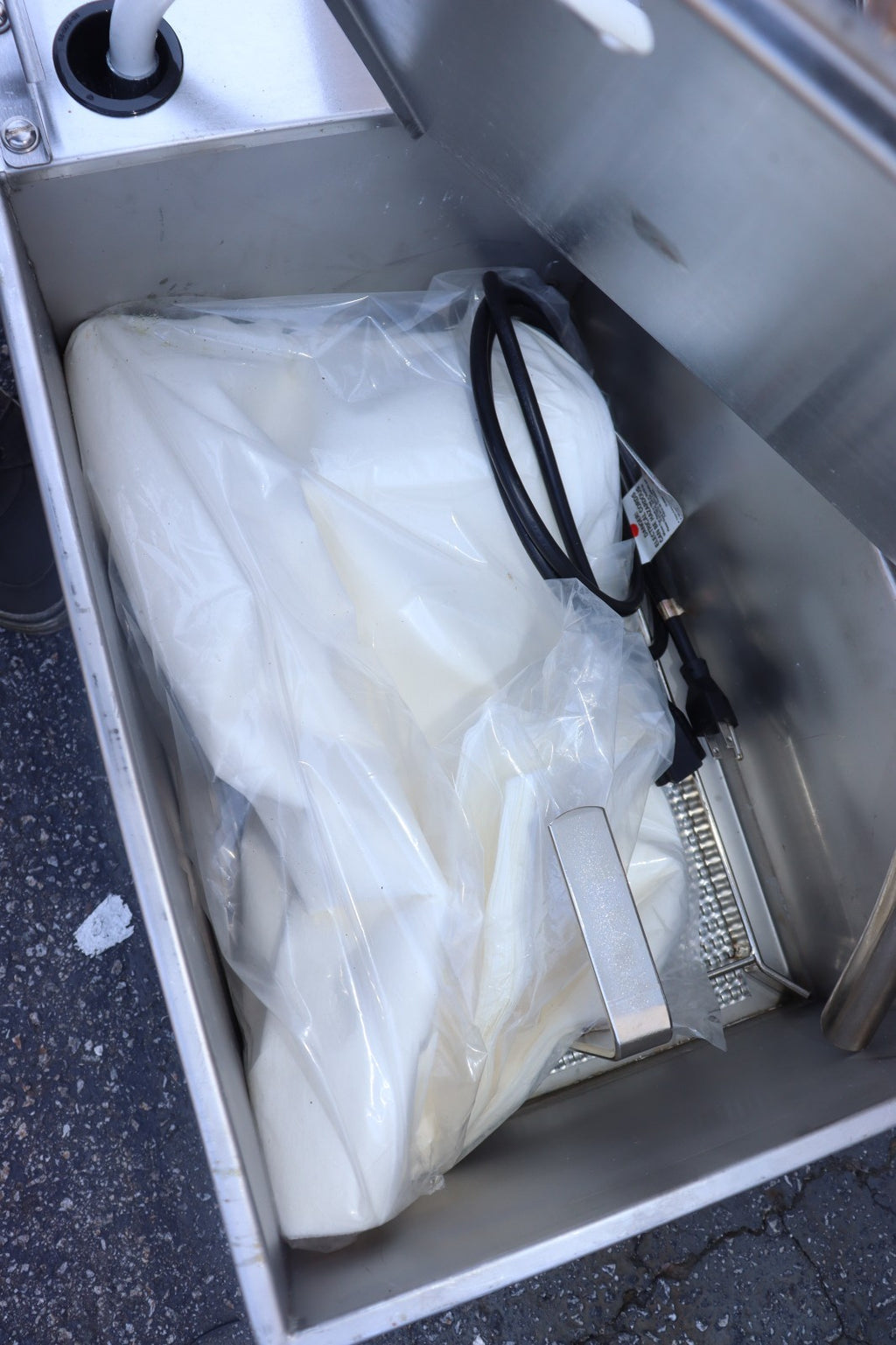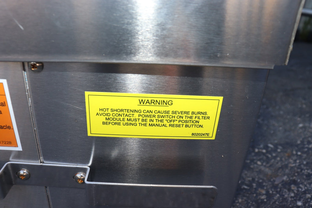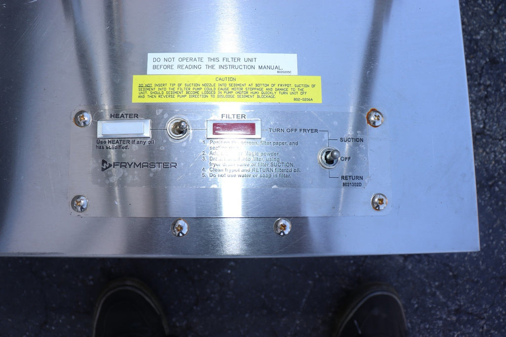 The NEW 50 LB Portable Oil Filter Frymaster PF50 is a high-quality commercial kitchen equipment designed by Frymaster. This oil filter is specifically manufactured in the United States, ensuring quality and durability. The addition of the heater and wheels makes it convenient for use in various food service establishments, providing a reliable solution for filtering and heating oil with ease. Perfect for restaurants and industrial kitchens, this portable oil filter offers efficiency and practicality in a compact design.