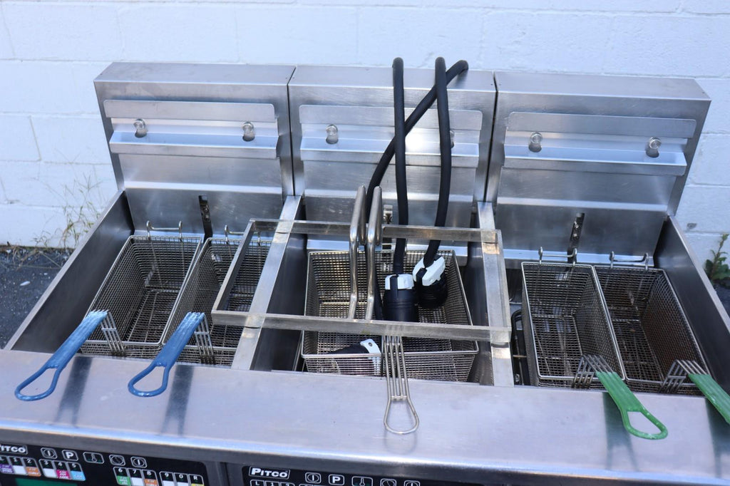 The Pitco Electric 208V 3 Phase, 50 lbs, 3 Pot SEH50 deep fat fryer is a reliable and efficient cooking equipment for commercial kitchens. With its floor model design and filtration system, it offers easy maintenance and cleanability. This fryer, suitable for restaurants and food service establishments, features three pots for cooking multiple batches of food simultaneously, making it ideal for busy establishments seeking quick and consistent cooking results. Built by the trusted brand PITCO, this electric fryer ensures quality performance and durability in professional kitchen settings.