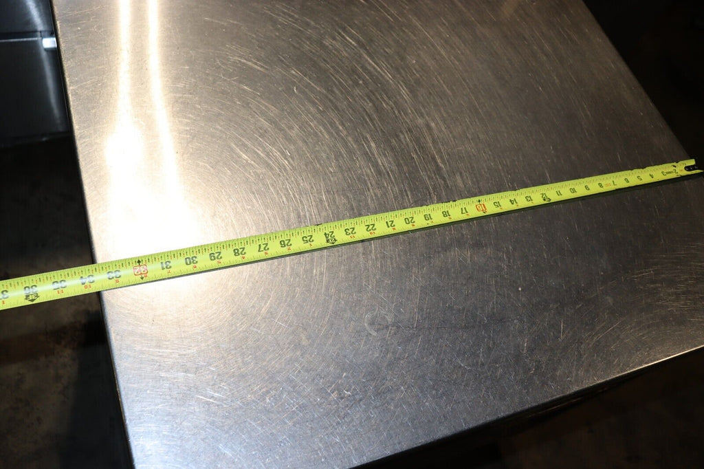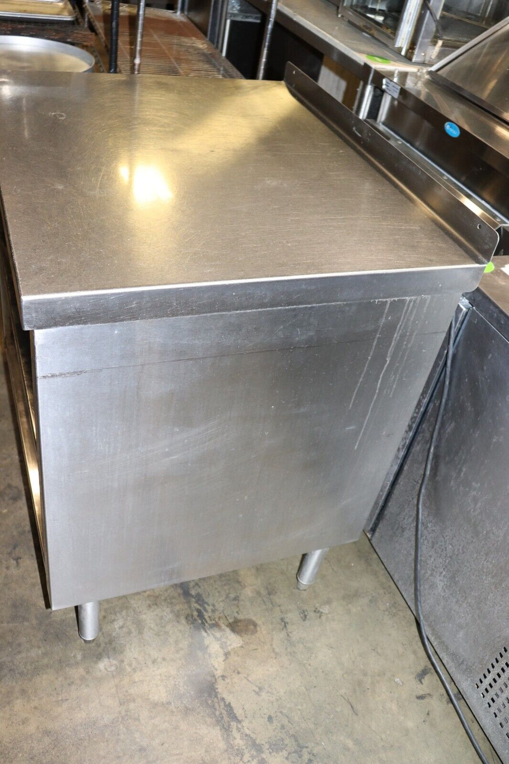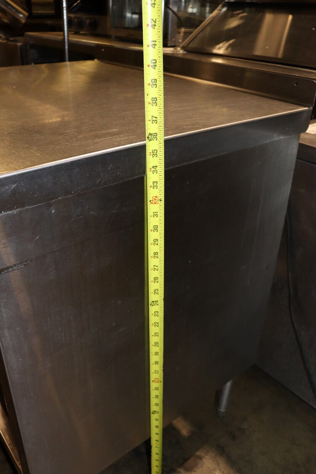 This product is a stationary stainless steel table with storage. It has a top material made of stainless steel and a cabinet base style. The table measures 33.5 inches in width and 28 inches in depth. It is suitable for use in commercial kitchens, restaurants, and food service businesses. The table is designed for food preparation and comes with storage space for kitchen equipment.