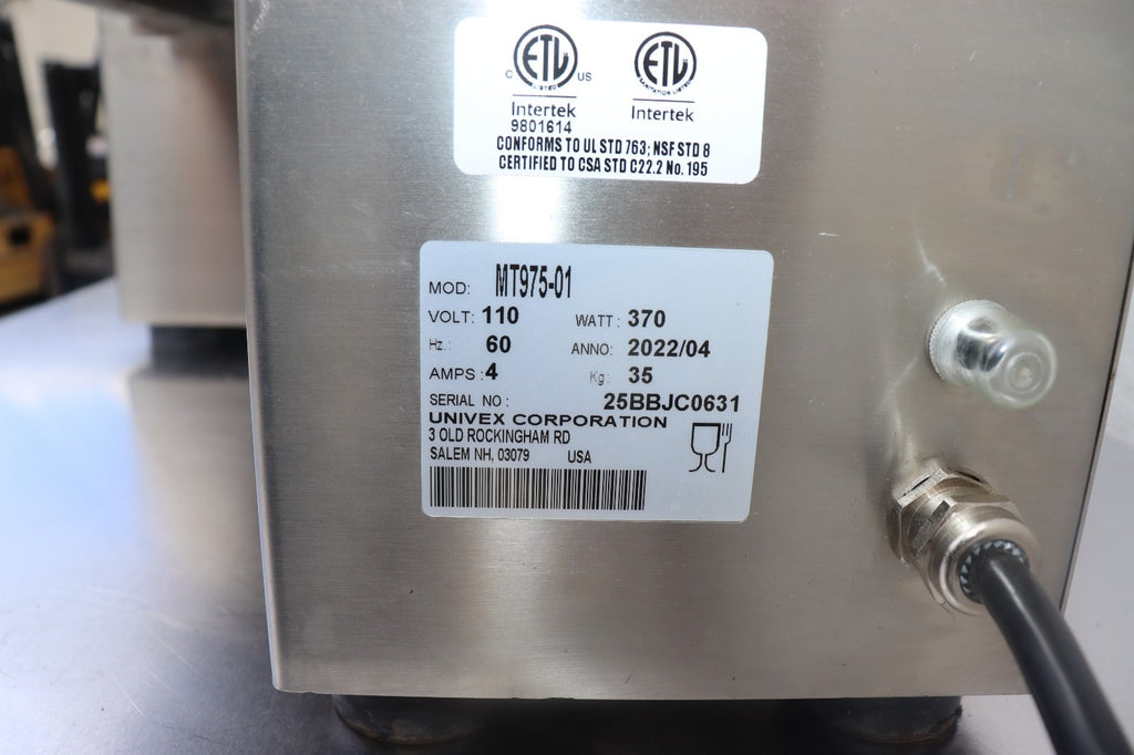 The Univex MT975-01 Countertop Meat Tenderizer is a new open box electric meat tenderizer designed for commercial kitchen use. With the Univex brand known for quality products, this model offers a reliable and efficient solution for tenderizing meats in restaurants or food service establishments. Its compact countertop design makes it easy to use and store in smaller kitchens, providing a convenient tool for preparing high-quality meats for customers.