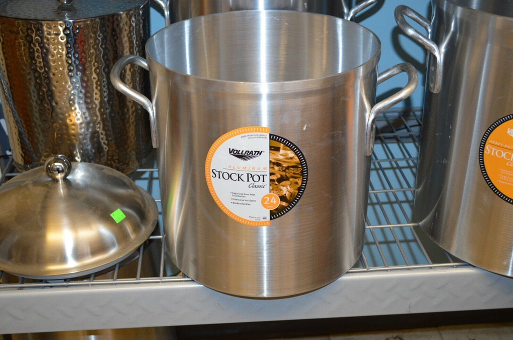 English and metric on inside walls. NSF Certified. Carbon steel core bonded with layers of 18-8 stainless steel. Solid welded stainless steel handles for durability and easy cleaning. Liquid measure capacities chemically etched in English and metric on inside walls. For use with conventional or induction ranges. Stainless steel interiors clean easily and will not react with food. Covers sold separately. 12" diameter. 24 quart capacity.